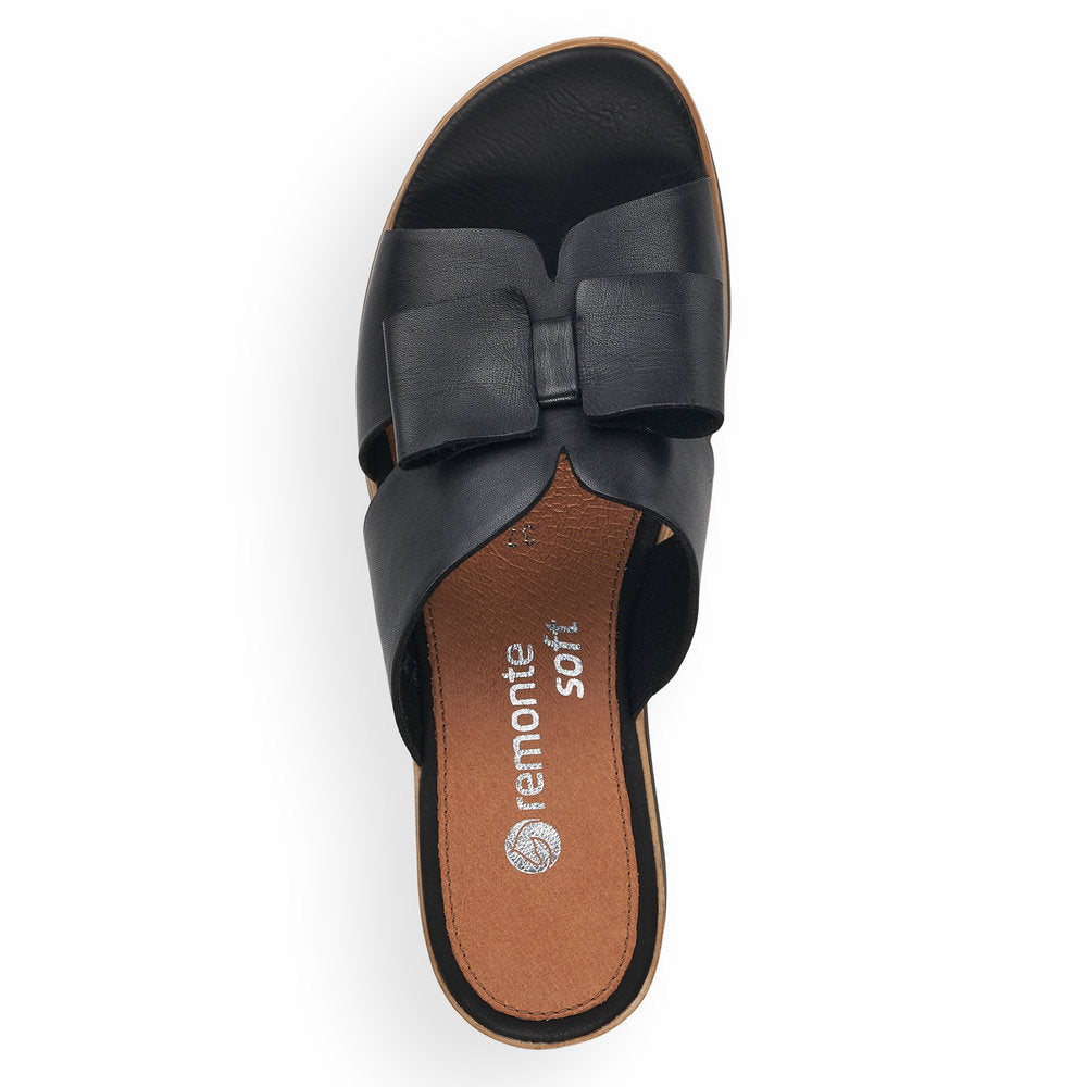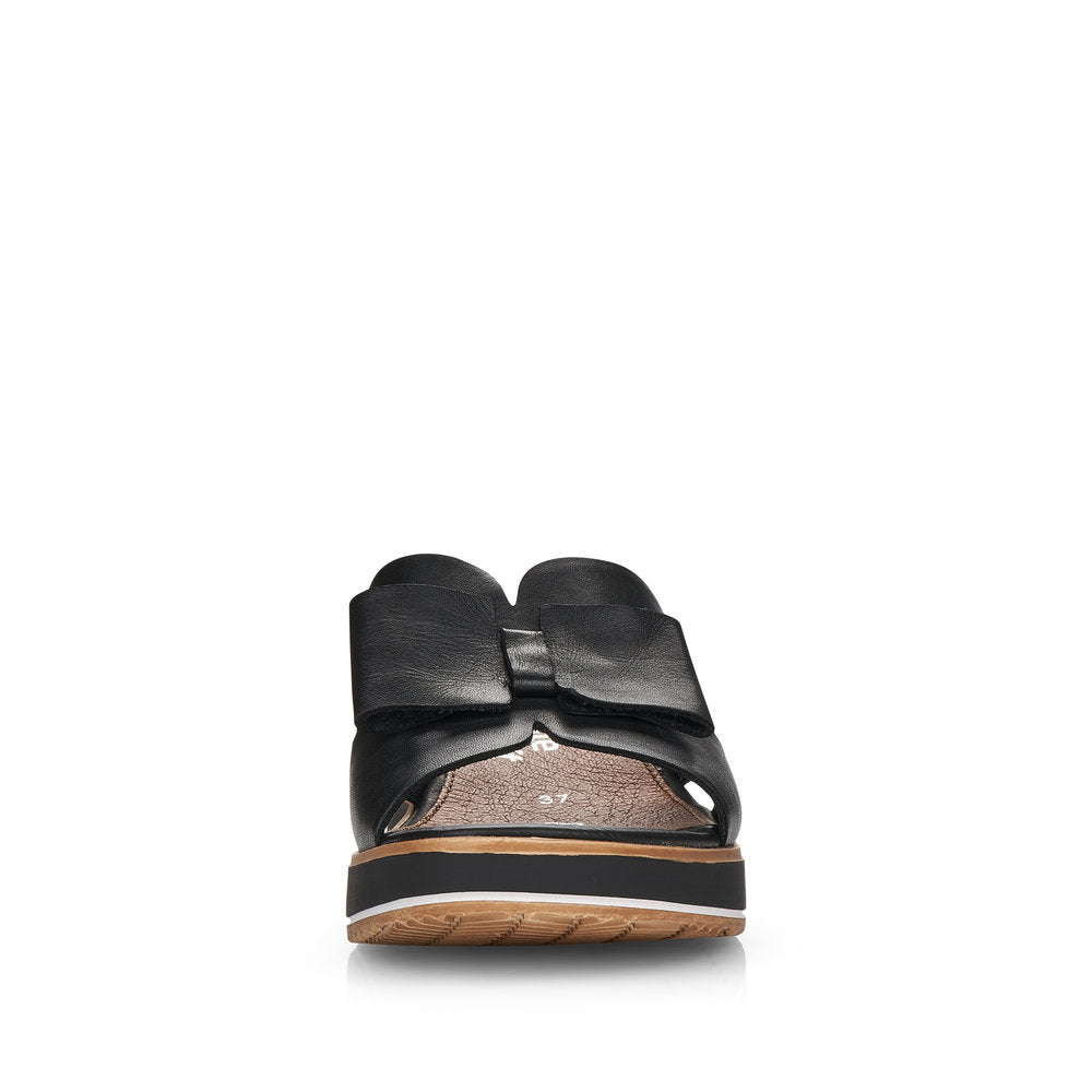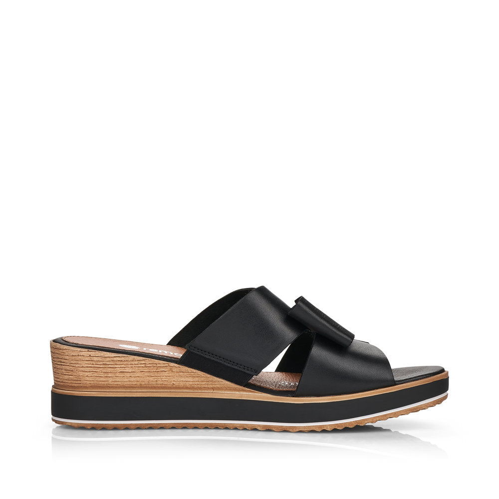 Shoes on - summer on! With these black remonte mules made of smooth leather you can show up anywhere! The elastic band makes it easy and comfortable to put on and take off the shoe. The soft insole meets a cushioning and light sole with wedge heel that superbly balances even hard ground. The model is optionally available up to shoe size 45. It doesn't get any more comfortable than this!