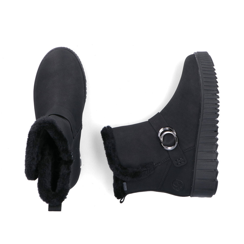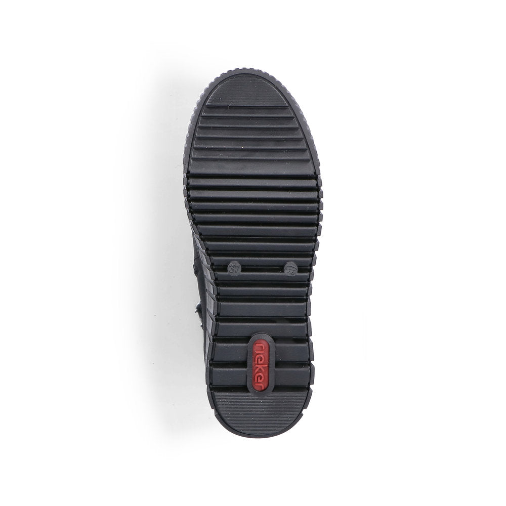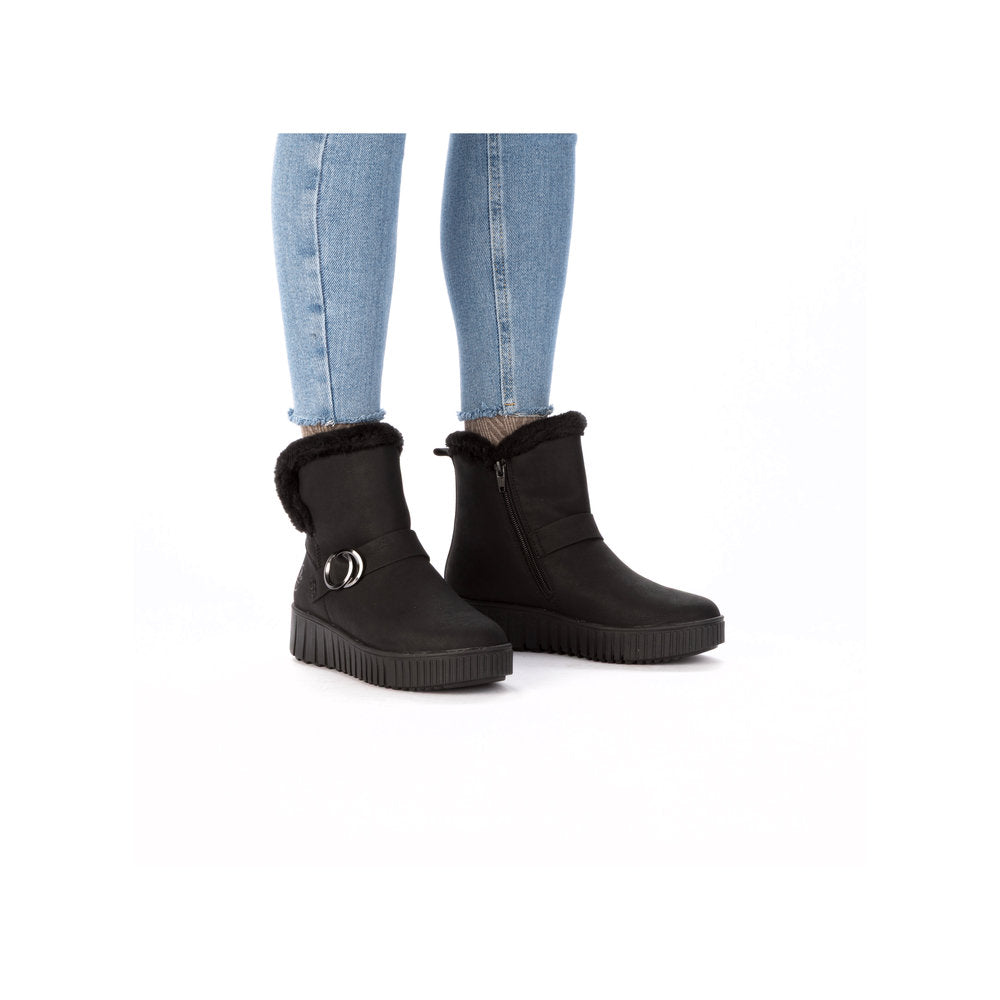 The cold is unable to harm you! These black Rieker ankle boots guarantee a heavenly feeling. A zipper allows for quick and easy donning. The furry shaft edge adds a fashionable touch to the design. The grippy sole gives good traction at every step. The boots have a padded and removable insole that is like holiday for your feet! The fluffy warm lining provides long-lasting protection against the cold and the water-repellent upper is effective against wetness and wind. Fashionable wellness feeling in Rieker style!