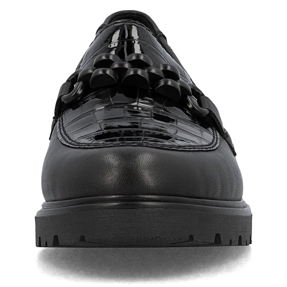 Fashionable must-have! These black Rieker loafers made of smooth leather combine cool design with best comfort and high functionality. The elastic band makes the shoe easy and comfortable to put on and take off. The decorative chain is a real eye-catcher. The light and grippy sole provides traction on different paths. In addition, the cover sole is extra soft. Fashionable well-being in the style of Rieker!